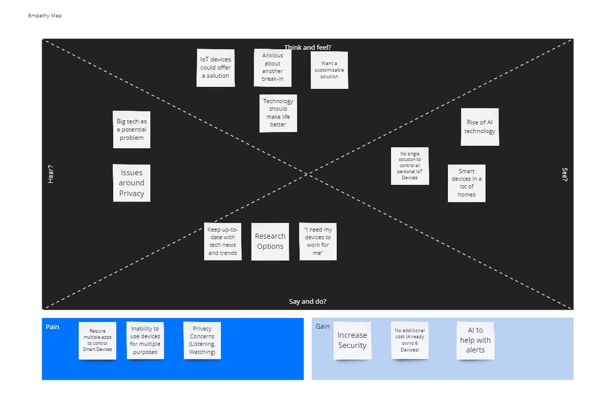 I wanted to get a better idea for how my users would feel and think so I decided to create an empathy map. This process really helped me to think of what my users would need and want from a control centre for their IoT devices